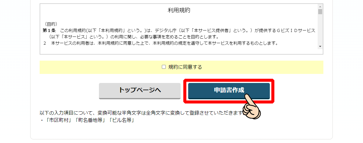 4.規約を確認して「規約に同意する」をクリックしてチェックを入れてから「申請書作成」ボタンをクリックします。